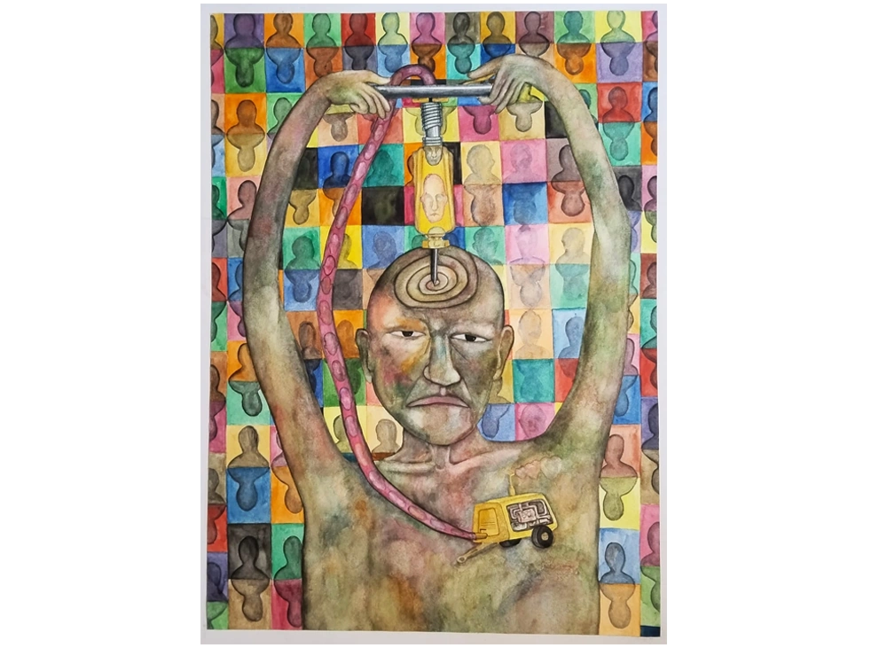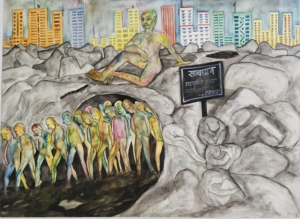Arun Maruti Peje is a contemporary artist whose practice reflects deeply on the fragile essence of humanity within the framework of urban life. His work critiques the increasingly mechanical and consumption-driven rhythm of modern cities, where genuine emotion is overshadowed by automation and routine. Through paintings such as Happy Journey, Fungus, Headache, and Relaxed City, Arun explores themes of alienation, disposability, and the gradual transformation of human beings into synthetic participants in a system that values function over feeling.