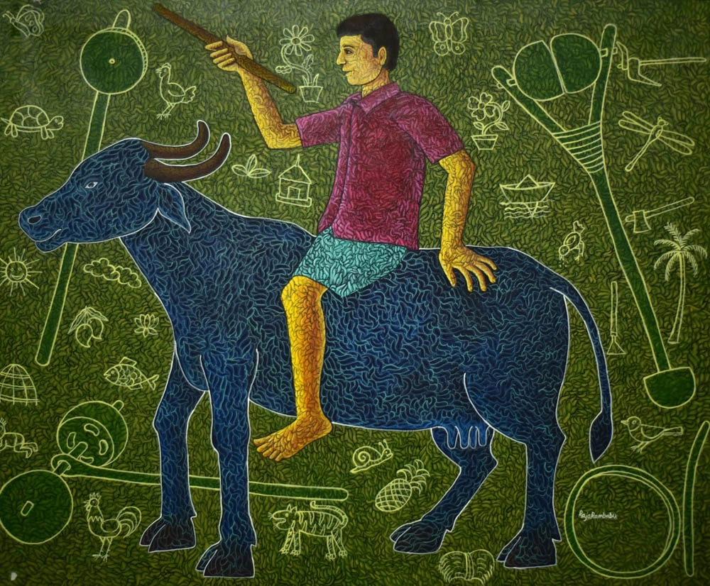 Raja Rambabu is a contemporary artist whose practice reflects a lifelong passion for painting and a deep engagement with memory, philosophy, and abstraction. Formally trained with a B.F.A. from Andhra University and an M.F.A. from Mysore University, he transformed his childhood passion into a professional pursuit.
